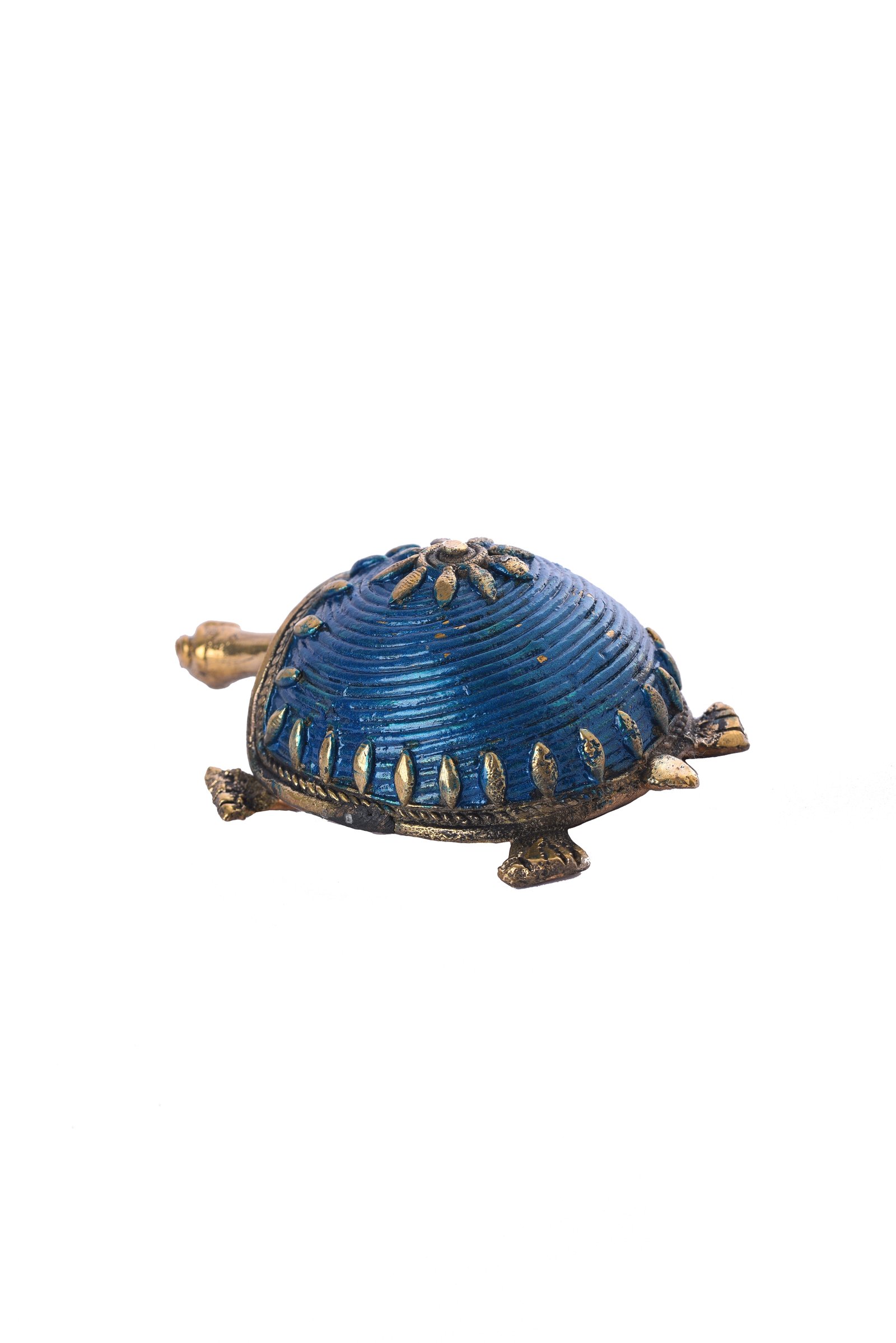 This exquisite Dhokra art tortoise figurine is a perfect blend of traditional craftsmanship and modern aesthetics. Handcrafted using the lost-wax casting technique, this piece features intricate antique gold detailing complemented by a vibrant blue enamel finish, making it a stunning decor piece. (Size 4X3X2 Inches Weight 0.200 Kgs)